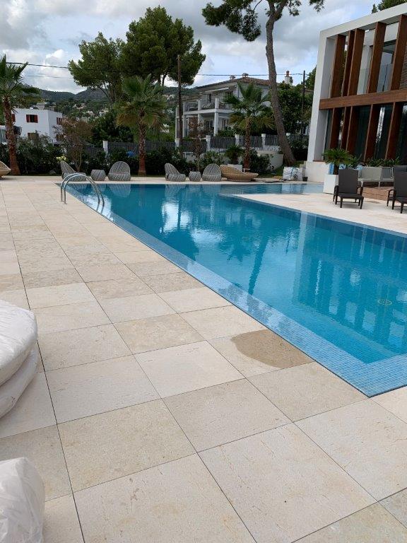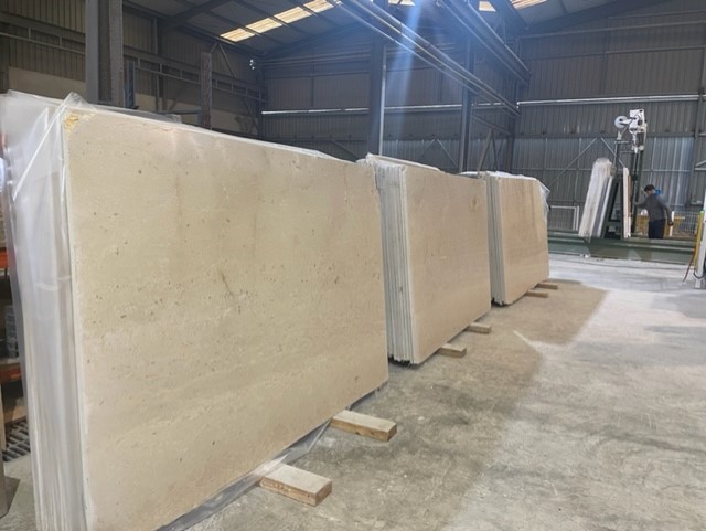 Crema Cenia ist ein sehr kompakter Kalkstein aus dem spanischen Katalonien. Er hat eine beige bis rosa-cremefarbene Färbung und ist mit Fossilienverkrustungen versehen.